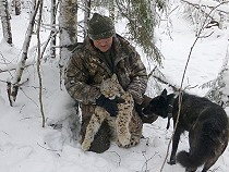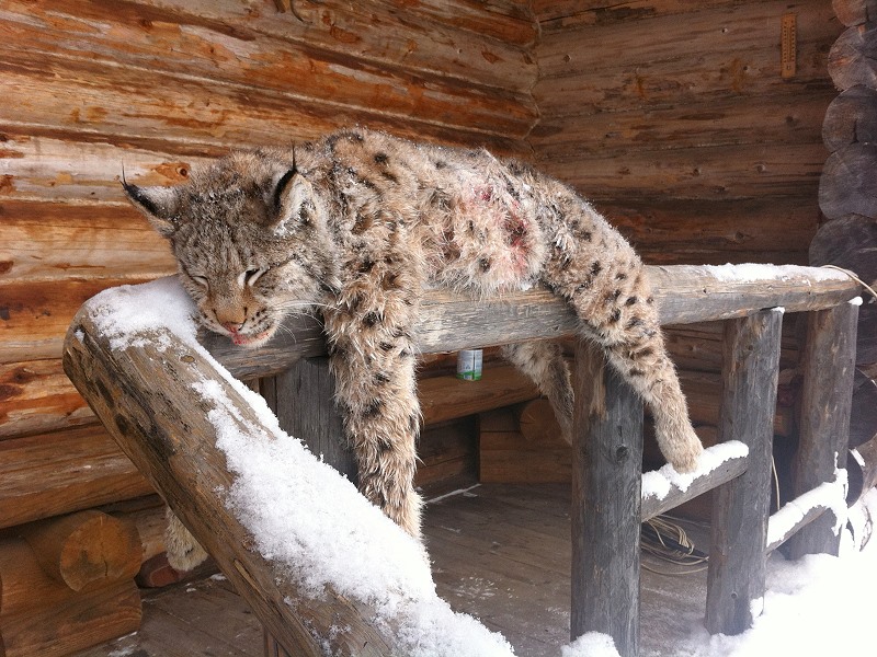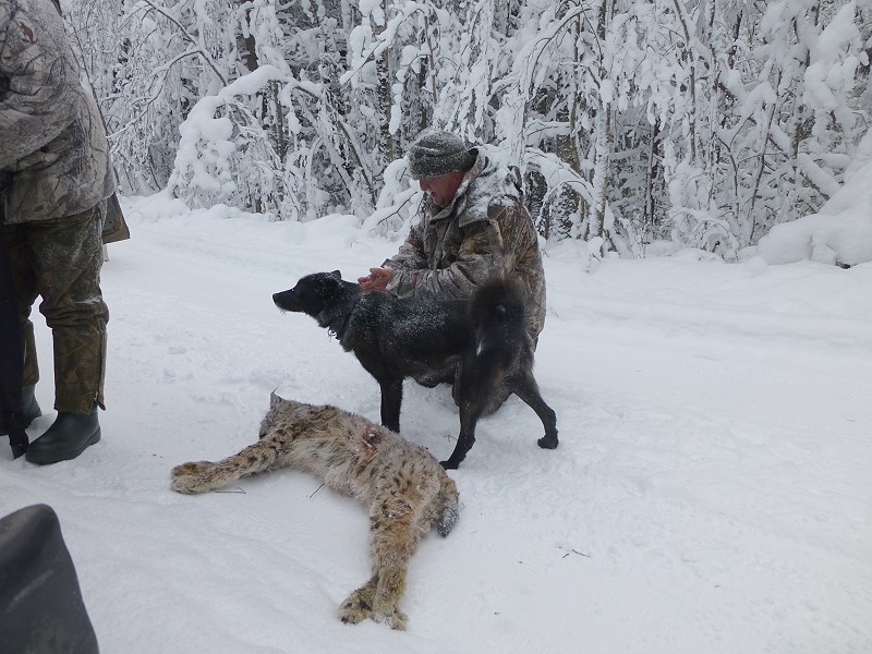 | Und so beginnt natürlich erstmal unser Fotoshooting, alle freuen sich über diese gelungene Aktion. Vor mir liegt ein etwa zweieinhalbjähriger Kuder, also ein männlicher Luchs, der sich vor den Hunden verteidigt hat. Er könnte locker einen einzelnen Angreifer töten. „Weibliche Luchse flüchten bei Hetzjagden mit Hunden eher auf Bäume“, übersetzt mir Sergey! |