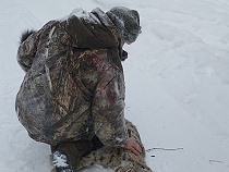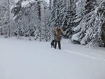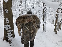 | Nun geht es darum den Kuder aus dem Wald zu bringen. Traditionell ist dies die Aufgabe des Schützen und so schultere ich meine Beute und trage den etwa 30 Kilo schweren Luchs kilometerweit aus dem Karelischen Winterwald. Meine Flinte übernimmt derweil Alex! |