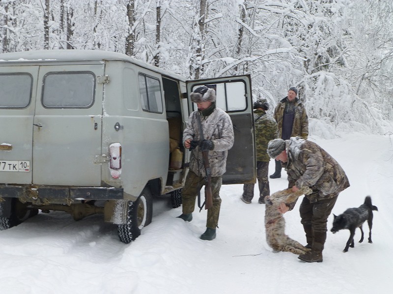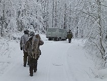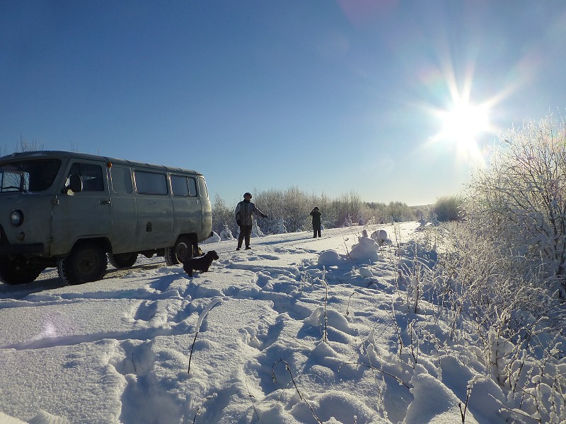 An einer Zufahrtsstraße wartet der Uaz-Bus. Gott sei Dank, ich bin platt vom tragen und trinke erstmal genüsslich meinen Tee, den Sergey hierher gebracht hat. Andere Jäger kommen hinzu und ich werde überhäuft mit Waidmannsheil Glückwünschen, wahrlich ein besonderer Tag heute, mein Geburtstag! |