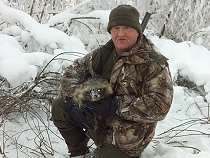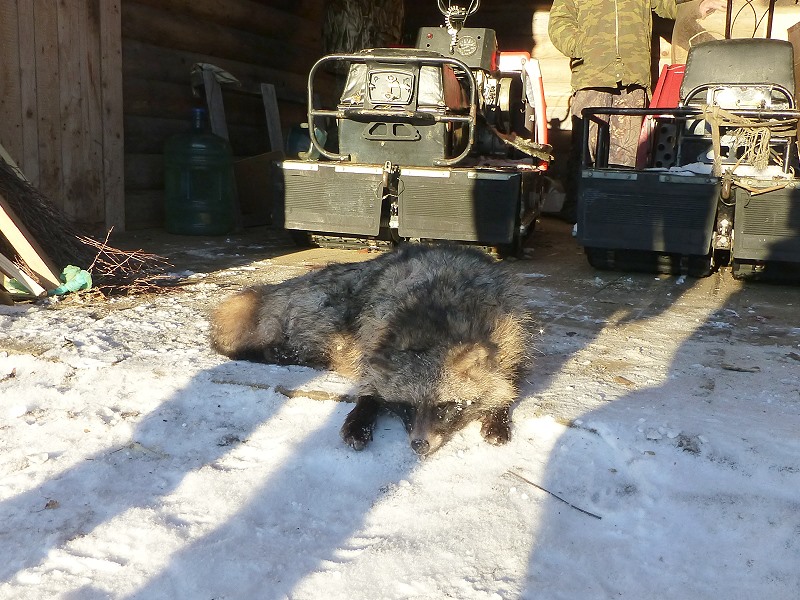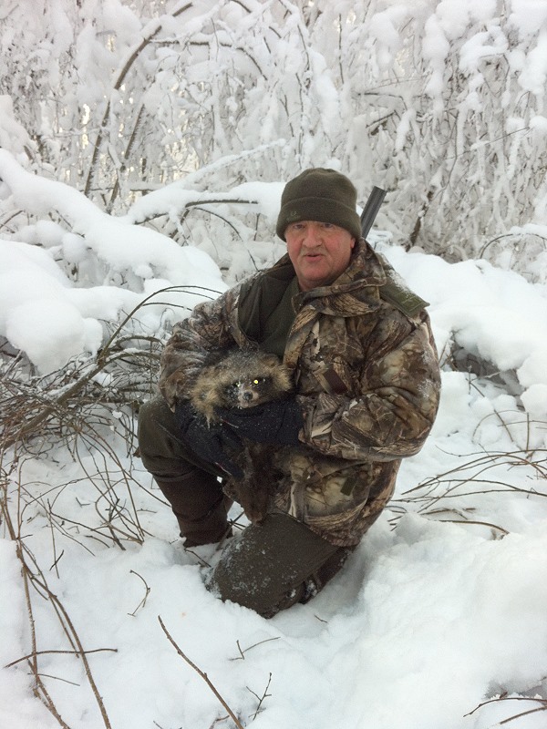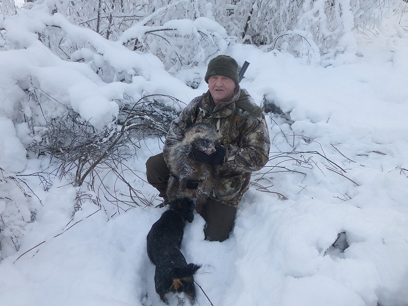 Am nächsten Morgen und es sollte auch unser letzter hier in Karelien sein, gehe ich noch mal mit Alex und Victor auf Jagd. Yucca wird auf die frischen Waschbärspuren angesetzt. Kaum auf der Fährte und wir hinterher, stellt Yucca ein graues Bündel fauchendes und kämpfendes Etwas da im Unterholz und als Alex seinen Hund zurückpfeift fliegt eine Geschossgarbe aus meiner Flinte, dem grauen kleinen Tierkörper, der aussieht wie ein junger Waschbär, hinterher und bannt das „ graue Fellbündel“ in den weißen Schnee! Es ist ein Marderhund. |
