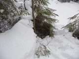 | Ich kämpfe mich durch den hohen Schnee bis zu Andrew und sehe, dass sich unser Wolf in ein Loch unter den Fichtenstamm eingeschoben hat, das der Schnee nicht zuwehen konnte, weil die vielen Äste der Fichte den Schnee oben tragen. Er liegt da unten zusammengekrümmt und als der Jäger Sergej mit einem Stecken hinein stochert, sehen wir deutlich, dass der Wolf noch atmet; das ist gefährlich, alle halten sich zurück! |