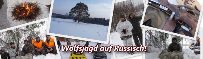 Bereits im Herbst vor zwei Jahren hat Wladimir Rjabov, Sergey und mich zur Lappjagd auf Wölfe hier nach Kopki in sein großes Revier eingeladen. Annehmen können wir die Reise erst jetzt, Ende Januar 2011, denn im letzten Winter gab es keinen Spielraum in meinem beruflichen Terminkalender. Und so sind wir beide einen Tag vor meinem Geburtstag unterwegs mit dem Flieger nach Moskau, um dann mit unseren Russischen Kunden und Freunden, Michael und Andrew, gleich weiter zu reisen. Mit dem Nachtzug ins weit entfernte Udmurtische Land, nach Osten, kurz vor das Uralgebirge. 18 Stunden dauert die Fahrt. Zu viert in einem typisch kleinen, aus den 60er Jahren stammenden Schlafwagenabteil, nebst noch älterer weiblicher Zugbegleiterin. Das lässt bei uns dann auch gleich den westeuropäischen Zivilisationsmechanismus abklingen. Da wir besteckmäßig mit nur einem Messer ausgerüstet sind, mampfen wir gemeinsam und ungeniert unsere vor der Reise im Moskauer Supermarkt erstandenen Fresspakete weitestgehend mit den Fingern. Ausgestiegen in irgendeinem kleineren Bahnhof, irgendwo kurz vor der Hauptstadt Ischewsk, pfeift uns sofort ein anderer, ein saukalter Wind ins Gesicht. 17 Grad Minus hat es hier momentan und der Chef- Mechaniker vom Jagdhof, der uns gerade in Empfang nimmt mit seinem UAZ-Bus meint “die letzten Tage hatte es hier bis unter 30 Grad Minus und jetzt wäre gerade eine seltene Wärmeperiode“. Gut, dass ich noch schnell in Deutschland eine mit Schaffell versetzte Unterwäsche- Garnitur erstanden habe und so ich schaue dieser kalten Herausforderung gelassen entgegen. Habe ich doch bei meinem letzten Besuch hier russische Winterjagdklamotten eingekauft, die jetzt zeigen müssen, dass sie ihr Herrchen auch schön warm halten können. „Priechali“ heißt „Angekommen“ auf Russisch und in der großen Jagdhütte hier am Rande des kleinen Dorfes Kopki ist der Teufel los, als wir vier da einfallen. Viele unserer Bekannten sind da, der Jagdchef Wladimir, sein Sohn Artem mit Frau, unsere Köchin Tanja und die Freundin vom Chef, die sonst alle Dinge in der Hand hält und für unser Wohlergehen zuständig ist. Ein schweres Abendessen folgt mit Speck, Fleisch gemischt vom Bär, Elch und Keiler, in Form von Hacksteaks. Dazu jede Menge Wodka und es zeigt mir, dass ich angekommen bin, denn all das gehört dazu zum Leben hier in dieser urtypisch unendlichen Weite Russlands, mit all seinen jagdlichen Herausforderungen. Bereits um 8:30 Uhr müssen wir Antreten am nächsten Morgen. Filzstiefel für ein paar Euro versetzen mich in Erstaunen, diese etwa einen Zentimeter dicken Socken zu Stiefeln erstarrt, sollen Sergey und mich bei diesen eisigen Temperaturen warm halten? Unter 20 Grad minus zeigt das Thermometer heute Morgen und ich bekomme auch noch einen weißen, nach Stall riechenden Schneetarnanzug zugeteilt, der mich wir eine Zwangsjacke in meiner gewohnten Bewegungsfreiheit behindert. |